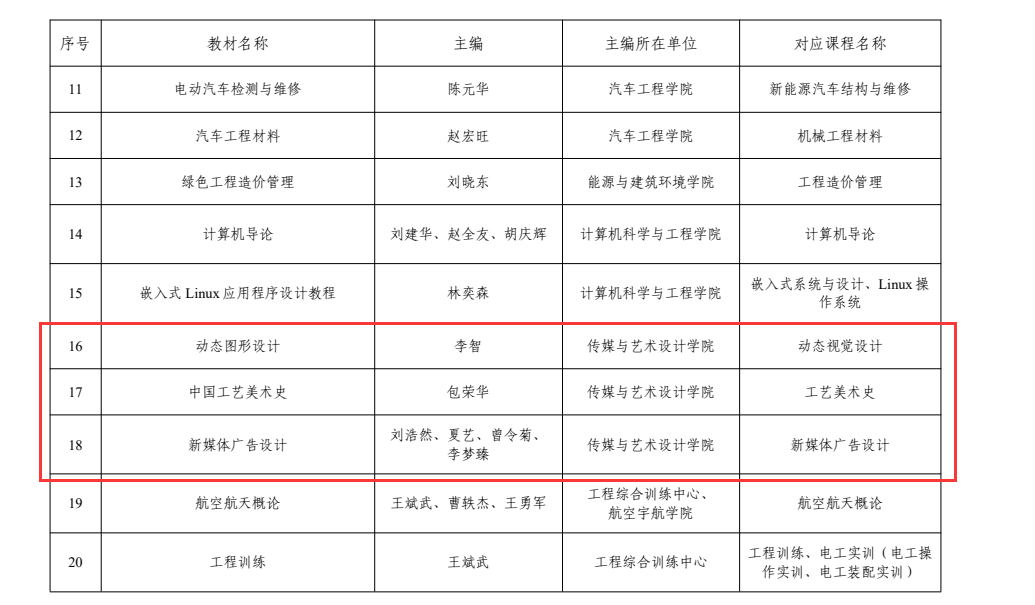 近日,学校发布文件《关于公布2023年教材建设项目名单的通知》桂航教[2023]57号,确定了学校2023年度校级教材建设项目立项名单。伟德国际1946源于英国《动态图形设计》《中国工艺美术史》《新媒体广告设计》三部教材获批2023年度校级教材建设项目立项。