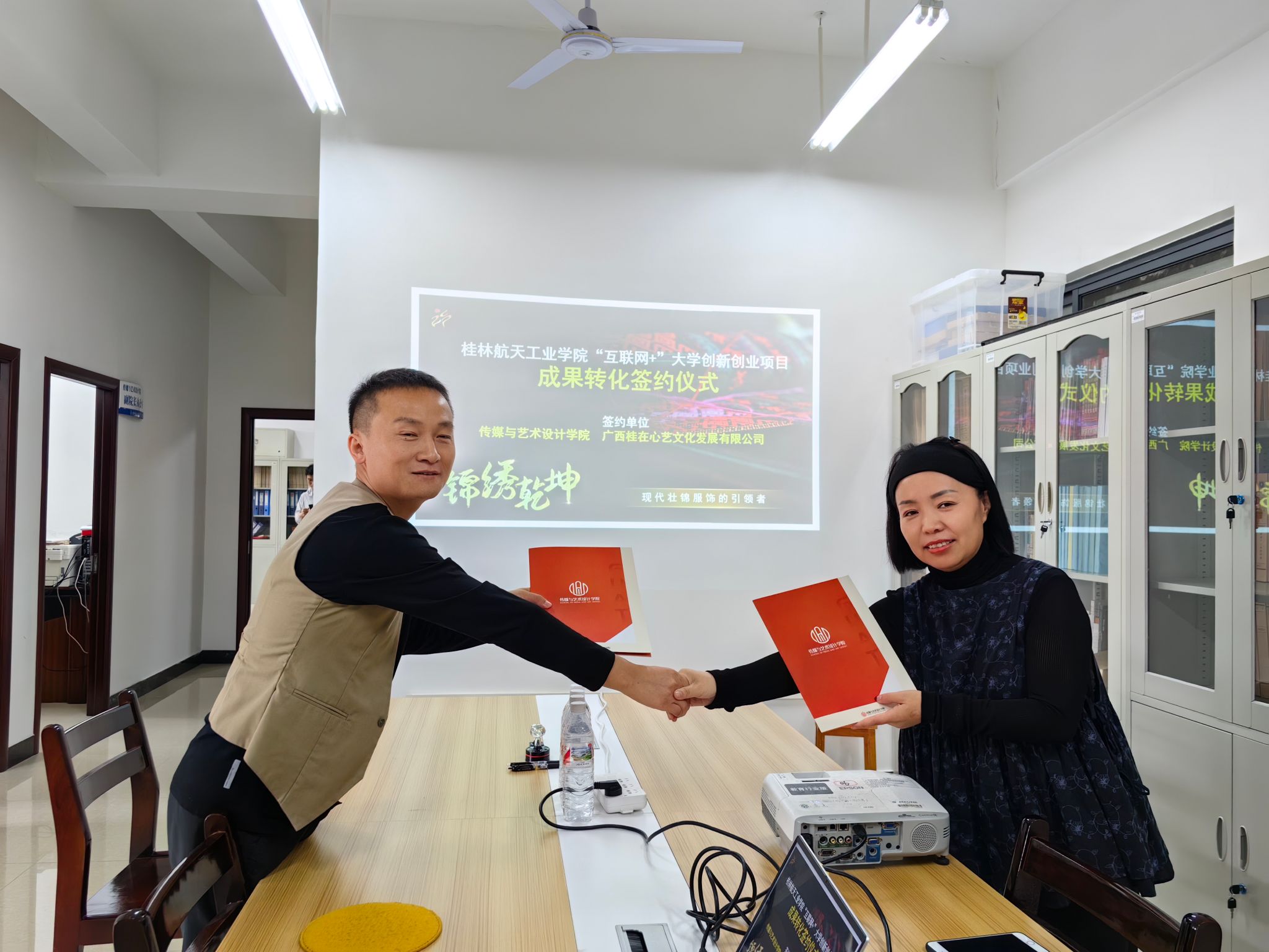 鉴于甲方(传媒与艺术设计学院“互联网+”大学创新创业项目《锦绣乾坤》)在设计领域具有专业的教学和研发能力,乙方(广西桂在心艺文化发展有限公司)在市场推广和商业运营方面具有丰富的经验和资源,本次签约仪式为了成果转化和应用,甲乙双方经友好协商,达成校企合作协议。