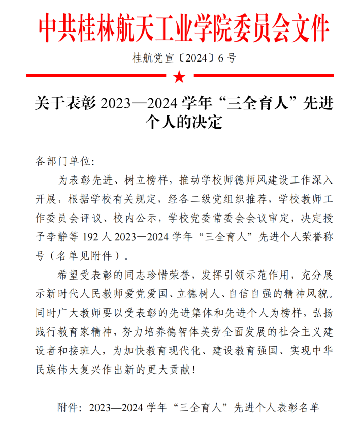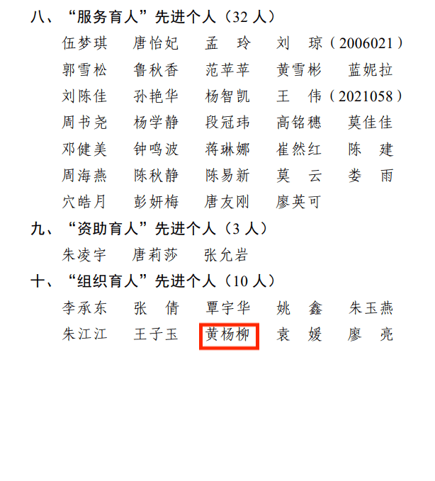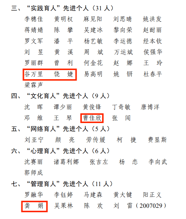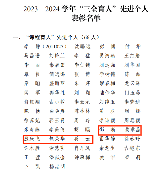 近日,学校下发表彰2023--2024学年“三全育人”先进个人的决定,伟德国际1946源于英国教师黄杨柳荣获“组织育人”先进个人;邵晰、黄章菡、殷庆飞、包荣华、蒋云荣获“课程育人”先进个人;曹佳欣荣获“文化育人”先进个人;谷万里、饶婕荣获“实践育人”先进个人;龚娟荣获“管理育人”先进个人。