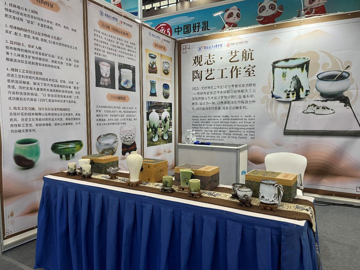 本次展览,学院精选工作室制作的5套桂林釉陶作品,原料全部取自桂林熔岩地质高钙、高铁、弱碱、肥沃的原矿土,经52道非遗工序炼就。以玛瑙釉呈现“漓江晨雾”,以石灰釉刻画“奇峰倒影”,通过高温窑变还原桂林山水“四时不同色”的灵动气韵。