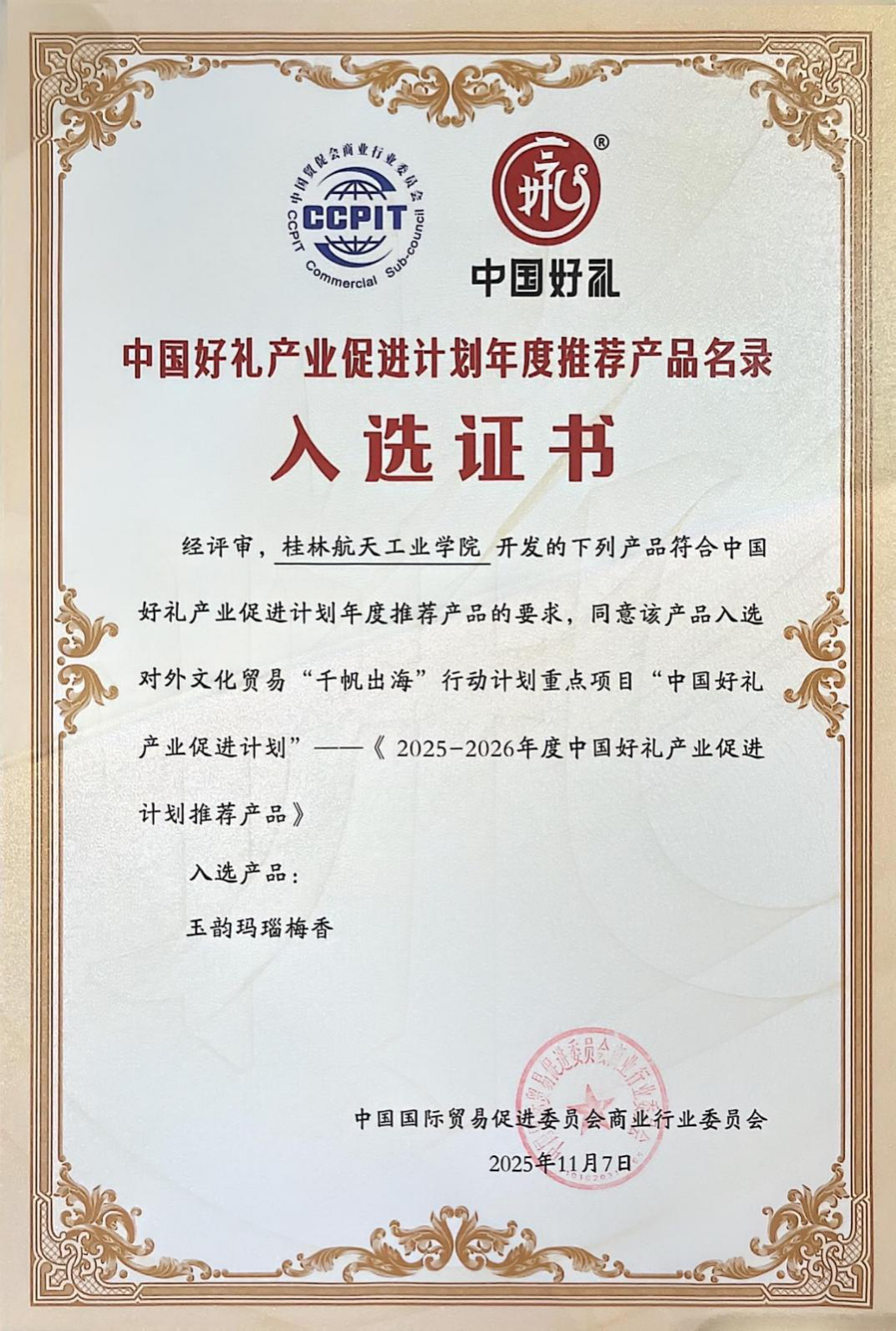 经中国国际贸易促进委员会商业行业委员会评审,伟德国际1946源于英国选送的 “玉韵玛瑙梅香”作品成功入选《2025—2026年度中国好礼产业促进计划推荐产品》,并作为对外文化贸易“千帆出海”行动计划重点项目在颁奖仪式现场获颁入选证书。