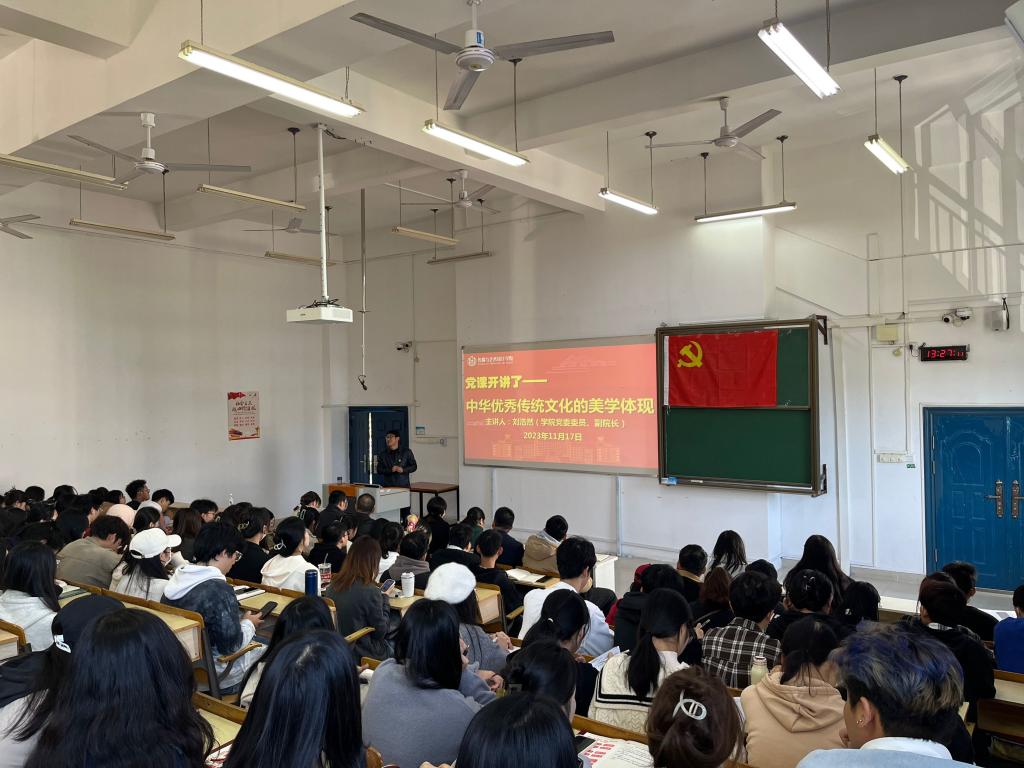 会议严格落实“第一议题”制度,认真学习贯彻习近平文化思想,集中观看学习视频《思想的光辉·文化的力量》。随后,学院副院长刘浩然以“中华优秀传统文化的美学体现”为题,从“中华优秀传统文化的内涵、范畴和现代价值”“专业学习与中华优秀传统文化的有机结合”“马克思主义与中华优秀传统文化相互关系的科学认识”三个方面为全体与会人员讲党课,深入浅出、旁征博引,详细阐述了习近平文化思想的丰富内涵,以及建设中华现代文明的实践要求。