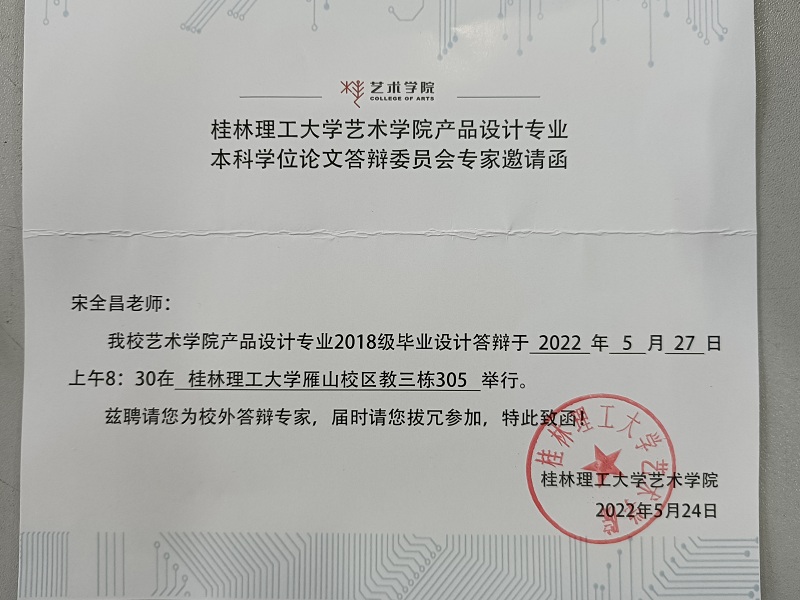 5月27日,伟德国际1946源于英国产品设计专业教研室主任宋全昌受桂林理工大学艺术学院产品设计专业答辩委员会邀请,作为桂林理工大学校外答辩专家参加该校2018级产品设计专业毕业答辩评审活动。