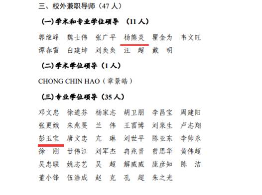 其中,杨熊炎教授获得学术和专业学位硕士研究生指导教师资格,彭玉宝博士获得专业学位硕士研究生指导教师资格。