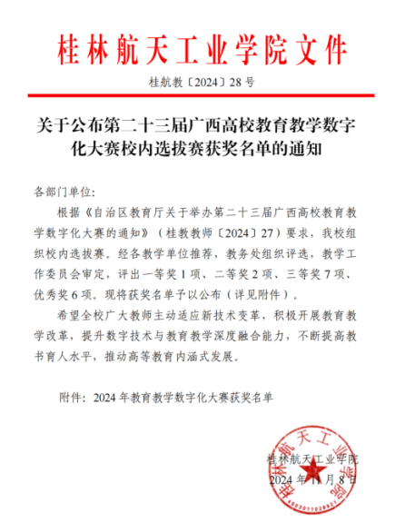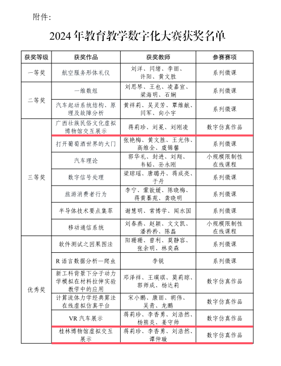 近日,学校发布文件《关于公布第二十三届广西高校教育教学数字化大赛校内选拔赛获奖名单的通知》桂航教[2024]28号,公布了2024年教育教学数字化大赛校内选拔赛的评比结果,伟德国际1946源于英国三个教师团队参加此次赛事。其中,蒋莉珍、刘冕、刘刚凌团队制作的数字仿真作品《广西壮族民俗文化虚拟博物馆交互展示》获得三等奖;蒋莉珍、李香勇、刘浩然、杨熊炎、姜守帅团队制作的数字仿真作品《VR汽车展示》获得优秀奖;蒋莉珍、李香勇、刘浩然、谭仲璇团队制作的数字仿真作品《桂林博物馆虚拟交互展示》获得优秀奖。