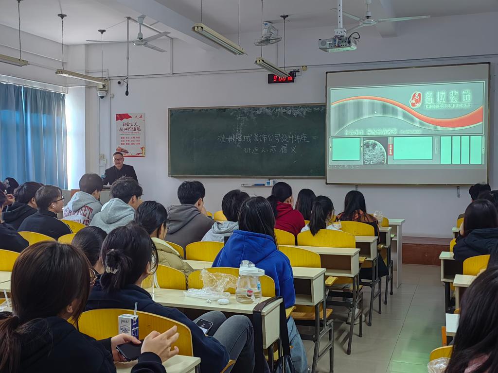 在2021级《室内设计专题实习II》实践环节教学中,为使学生进一步了解娱乐空间的设计技巧,增进对于实习就业的了解,增强学生的创新能力,伟德国际1946源于英国于2023年11月21日上午09:00-12:00,分别邀请桂林名域装饰公司负责人苏履义、桂林创旅室内装饰设计有限公司负责人黄普玉、伍义砖,入校开展了两场专题设计讲座。讲座主题分别为“项目案例与实习就业经验分享”“KTV设计技巧、材料与案例分享”。讲座由学院环境设计教研室主任杨军侠、设计基础教研室主任夏艺主持,地点明志楼212教室,2021级建筑室内设计专业全体同学参加此次讲座。