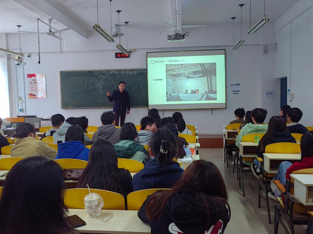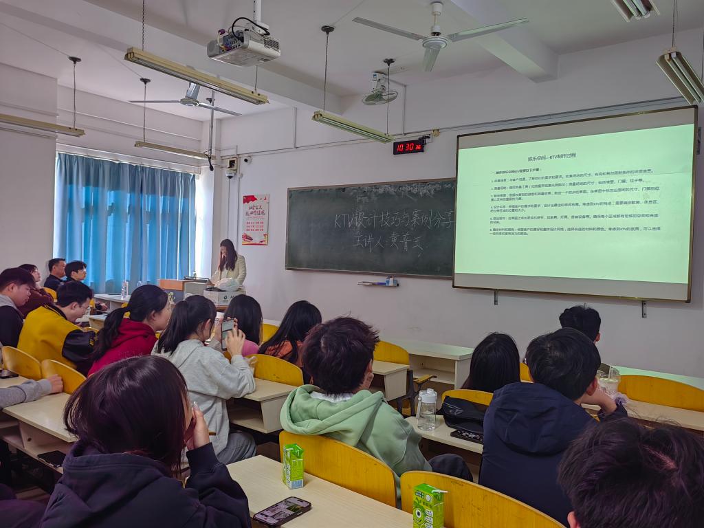 在“项目案例与实习就业经验分享”主题讲座中,苏履义总监结合自身从业多年经验为学生讲解如何如果选择实习就业单位与就业方向,并结合公司设计案例分享专业学习方法与实习就业经验;在“KTV设计技巧、材料与案例分享”主题讲座中,黄普玉总监结合公司多项已落地的娱乐空间设计项目,细致分享了相关设计过程及KTV空间设计技巧;伍义砖经理结合KTV空间中的设计材料,为学生解读项目的施工方法、技巧,并现场演示材料的应用。讲座最后,各位总监通过现场答疑与交流,耐心解答同学们的各种疑问。讲座赢得了广大同学们的喝彩与好评,会后参加本次讲座的同学们纷纷表示收获很大。