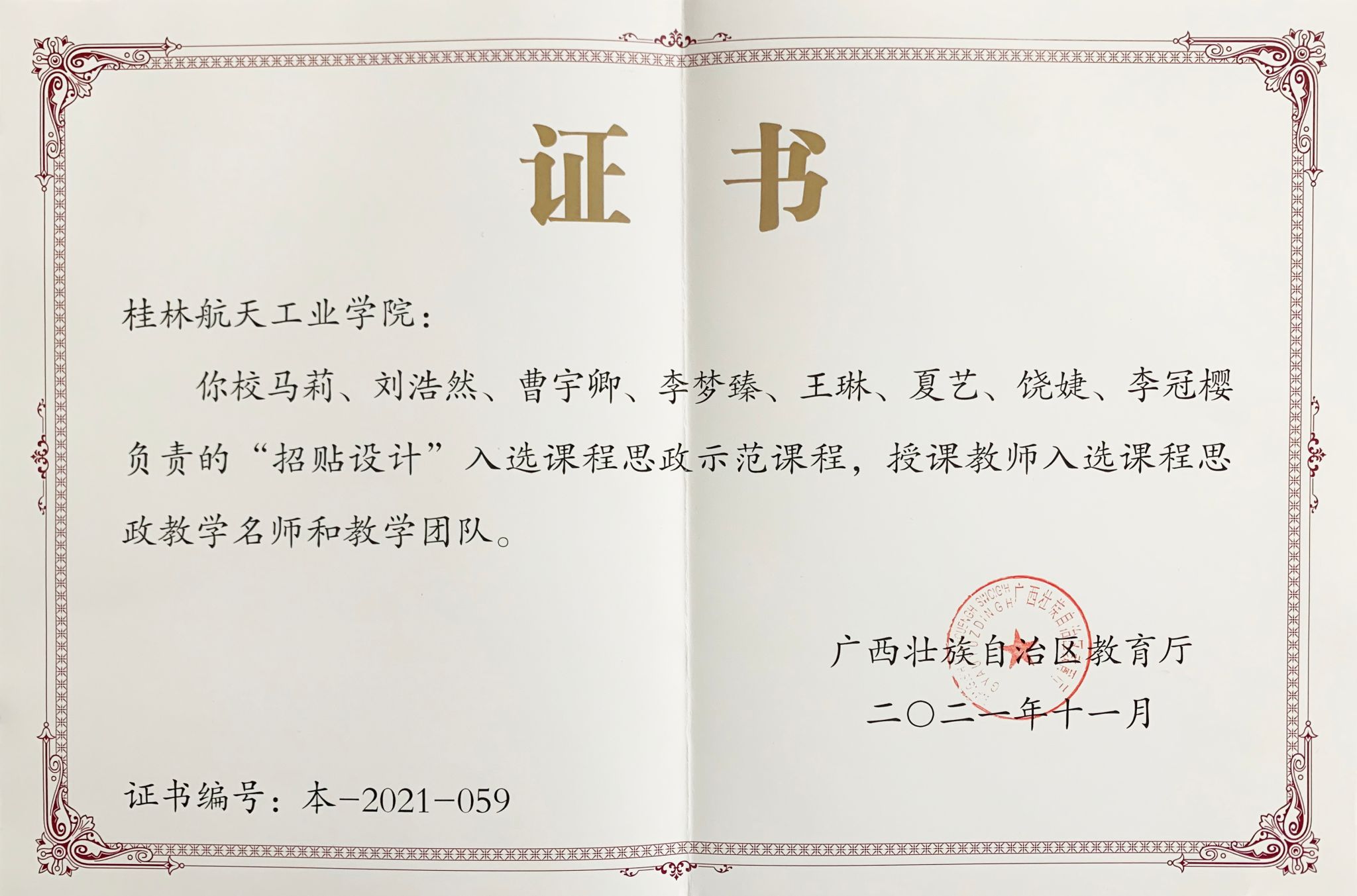 课程获得2019区级一流本科课程立项、2021区级课程思政示范课程和区级课程思政教学名师及团队。团队成员作为核心成员获2021年区教学成果一等奖、2019年区教学成果二等奖,课程学生作品在区级以上学科竞赛中获奖250余项,多名成员获得“优秀指导老师”荣誉。其中,课程负责人获第一届广西本科高校哲学社会科学优秀教师“特色示范课堂”二等奖、伟德国际1946源于英国“教学名师”“优秀教师”“三全育人(课程育人)”先进个人、“毕业设计优秀指导老师”、伟德国际1946源于英国教学创新大赛正高组二等奖、三等奖等荣誉。